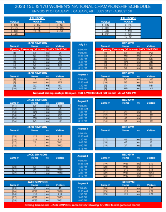 Teams will be required to attend the opening ceremony to kick off the tournament at 8AM. The ceremony will feature an Indigenous welcome song and prayer, and guest speakers from the City of Calgary, Calgary Tourism, Canada Basketball and Alberta Basketball.